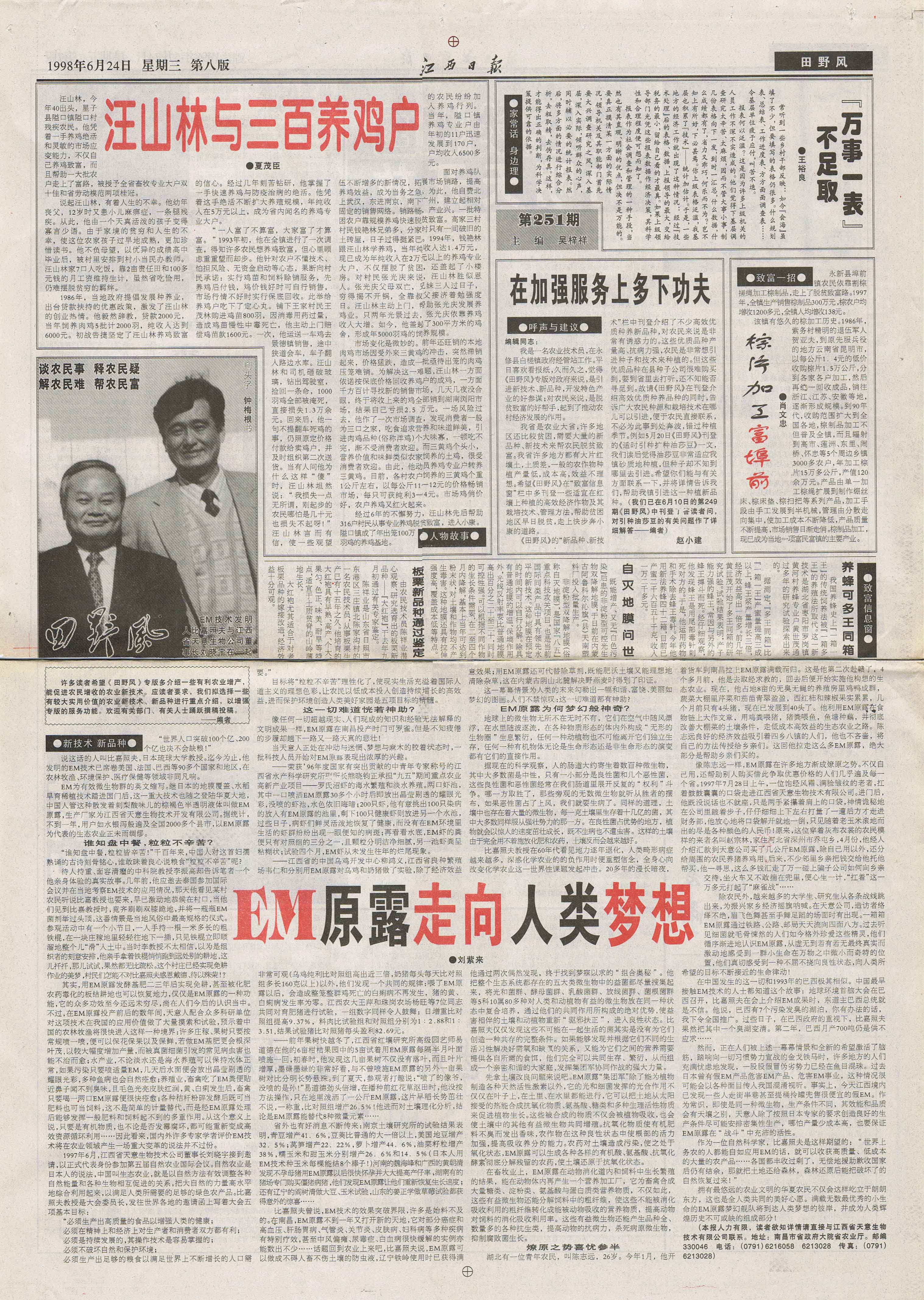 1997 1997年,継《中國畜牧水產報》、《科技日報》、《經濟參考報》、《江西日報》等媒體發表長篇通訊《EM原露正在改變世界》,各省科技、農業報刋均紛紛轉載,EM原露在江西最初的使用效果迅速在全國范圍內興起了一股熱潮,兩年內共簽定縣級代理合同500余家。